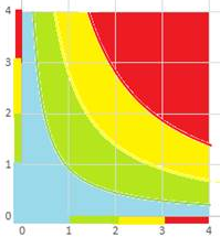С дискретными значениями вроде все понятно... но если указанная дискретизация не подходит для наших задач? Или я вообще хочу использовать по странной причуде непрерывные шкалы для оценок? Если подходить к вопросу "в лоб" то получится примерно следующее распределение зон риска (только шкалу влияния на бизнес я перевернул и сделал 4 зоны):